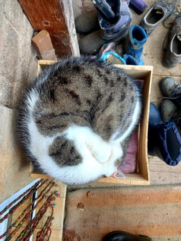 Vielleicht ist das so eine dicke Sorte, meinte Anni letztens, als wir unseren riesigen Kater Bruno betrachtet haben – riesig in Länge und Breite. Vor kurzem hat er sich in ein winziges Kistchen auf der Veranda gerollt. Ohne diese Katzen wäre mein Leben sehr viel weniger reich, sie erhellen mein Gemüt immer wieder neu.