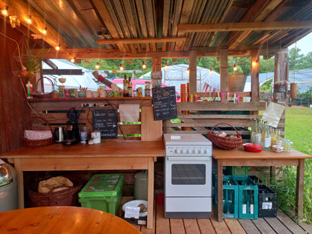 Und an einem der letzten Grasmuldentage habe ich es dieses Jahr tatsächlich geschafft, eine Gazpacho zu machen – eigene Tomaten und Gurken, eigene Paprika und sogar Wassermelone aus unserem Garten. Zubereitet in unserer Camperküche, die immer wohnlicher wird, während eines Besuchs meiner lieben Schwester aus München. Sie hat diesen Spätsommertag konserviert, indem sie ein paar Gläser Tomatensauce vom Blech für sich eingemacht hat.
